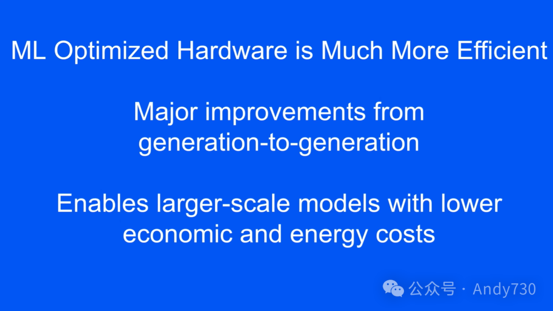 针对机器学习优化的硬件更加高效,每一代的改进都显著,这使得这些大规模模型可以以更低的经济和能源成本实现。