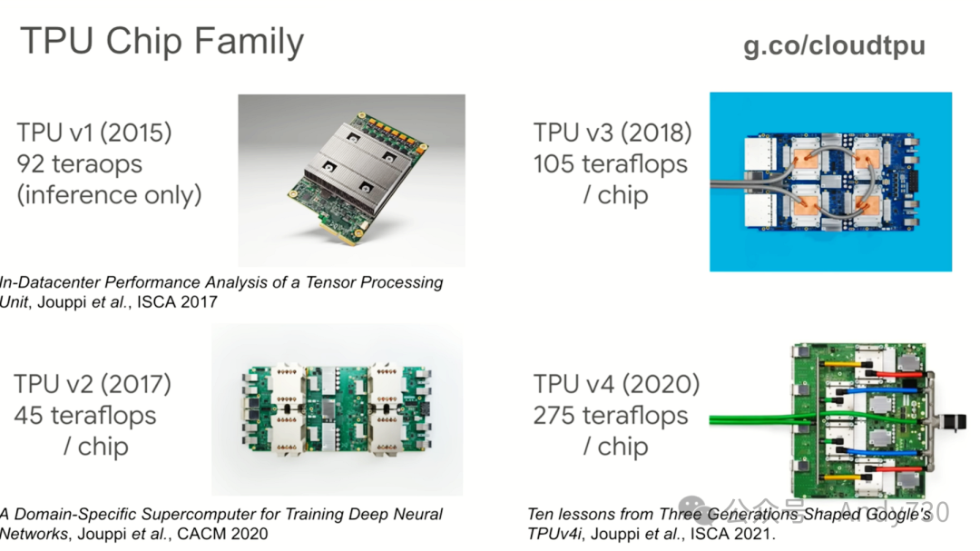 谷歌在这方面已经进行了相当长时间的工作。我们发现系统中确实需要构建这样的硬件系统。最初版本的Tensor Processing Unit(TPU)实际上是专为低精度线性代数设计的架构。我们构建的第一代TPU是用于推理,即在训练好的机器学习模型基础上进行生产环境应用。需要进行大量计算来识别图像中的内容或理解音频中的语音。因此,我们构建了第一代TPU V1,这实际上只是一个单卡系统,配有一个加速器。这一代TPU在能源效率和计算性能方面,相比当时的CPU提高了大约30到80倍。
