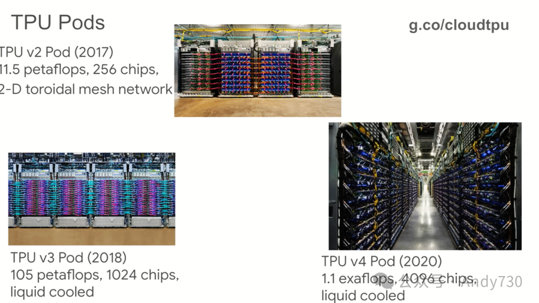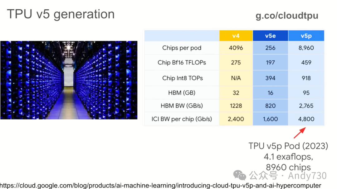 最近的一代是V5系列,我们在去年底公开了它。它有两个变体:一个用于推理,包含256个芯片的Pod,另一个是V5P,具有更多的每芯片内存、更高的芯片间带宽以及更大的内存带宽。每个芯片接近拥有半个petaFLOP的16位浮点性能,整数性能则为其两倍。这些Pod的规模也更大,接近9000个芯片,提供exFLOPS级别的计算能力。