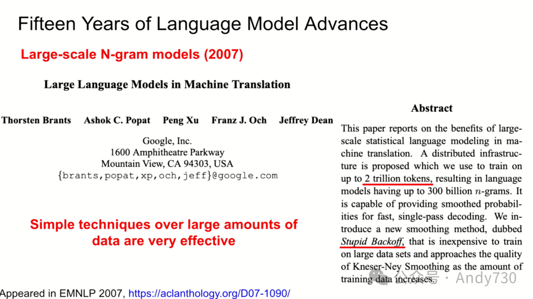 我们提出了一种创新的算法,称为“Stupid Backoff”,它跳过了复杂的数学方法,采用了更简单的处理方式。当你查找5-gram但没有数据时,你可以查找它的前缀4-gram,如果有就使用它。如果4-gram也没有,就查找3-gram,以此类推。这种方法比复杂的Witten-Bell平滑算法效果更好,因为后者虽然理论上更适合,但计算上较为困难。