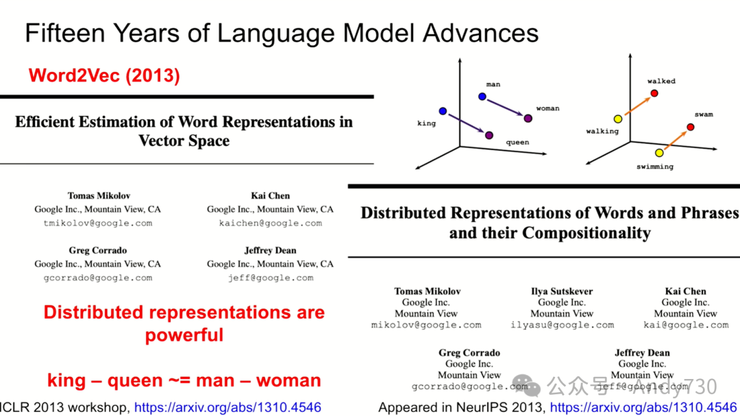 随后,我的同事Tomas Mikolov对分布式表示产生了兴趣。因此,我们将词表示为高维向量,而不是离散的表示。我们用不同的100维向量来表示不同的词,并通过训练过程使得出现在相似上下文中的词尽可能接近,而出现在不同上下文中的词则被推远。如果你在大量数据上进行训练,使用相对简单的训练目标,即“如果这些词出现在相似的上下文中,就把它们推得更近;如果它们出现在不同的上下文中,就把它们推得更远”,并在万亿个token上进行训练,你会得到非常好的结果。在这个100维空间中,尽管100维空间难以直观理解,但相似的事物会彼此靠近。例如,“山”、“丘”和“悬崖”会在这个高维空间中彼此接近。空间中的点很有趣,但更有趣的是方向在这个高维空间中也有意义,因为你可以在100维空间中选择许多不同的方向。例如,从“国王”到“女王”的方向可以通过计算“国王”减去“女王”的向量得到,这个方向与从“男人”到“女人”的方向相似。因此,方向具有意义,不同的方向代表不同的含义。将动词的现在时转变为过去时是一个不同的方向,不论动词是什么。这表明分布式表示具有巨大的潜力,它们在100维向量中编码了多种不同的信息。