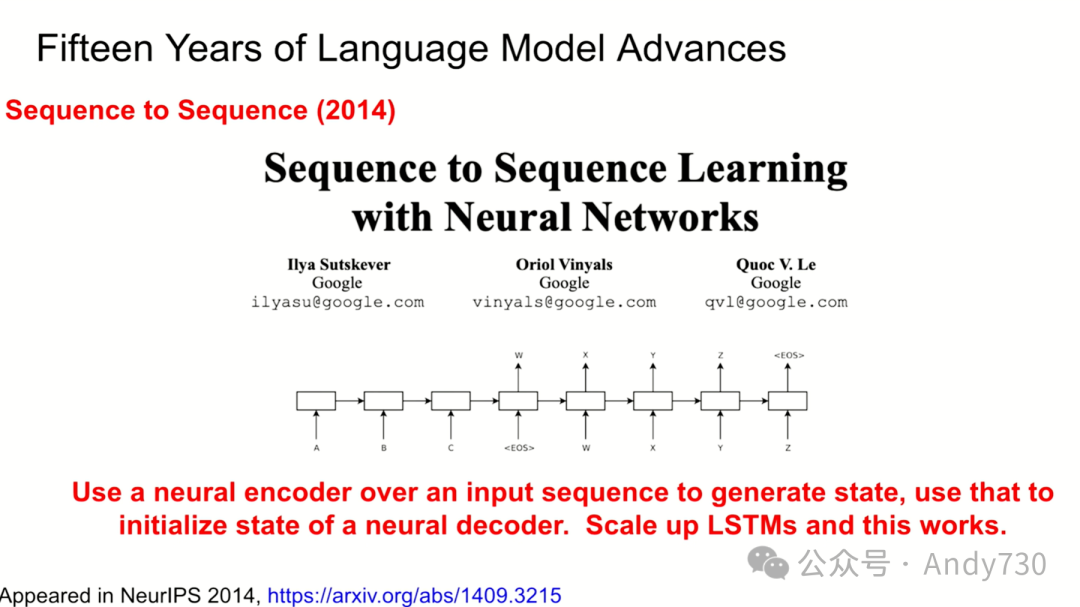 接下来,我的同事Ilya Sutskever、Oriol Vinyals和Quoc Le开发了一种名为序列到序列学习(Sequence-to-sequence learning)的模型。这个模型主要利用了神经网络,其中输入是一个序列。例如,在翻译任务中,你逐字输入一个英文句子,系统会根据当前状态和新输入的词来构建表示并更新状态。类似于单词的分布式表示,现在你可以为整个句子构建一个分布式表示,并使用一种叫做长短期记忆(LSTM)的递归神经网络来更新它。当遇到句子结束token时,你可以训练模型输出该句子的正确翻译。我们有大量的训练数据,比如英文句子及其对应的法文句子,通过这种配对数据来训练模型,使其在遇到英文句子时能够输出相应的法文句子。通过在大量配对数据上重复这一过程,你可以利用神经编码器来初始化状态,从而进入“我已经理解了输入句子,现在要逐字解码”的模式,以获得正确的翻译。将这一方法规模化应用,可以显著提升翻译准确率。