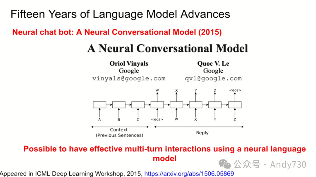 随后,Oriol和Quoc发表了一篇论文,展示了除了翻译外,还可以利用上下文处理多轮对话。基本上,就是你与某个人或实体的互动序列,以及计算机模型的回应,然后对方再作出回应,这些构成了上下文,即之前的多轮互动。你可以训练模型在这些多轮互动的上下文中生成合适的回复。基本上,这还是同一个序列到序列模型,但现在序列是由所有对话回合的上下文初始化的,从而可以使用神经语言模型进行有效的多轮对话,这一点非常巧妙。