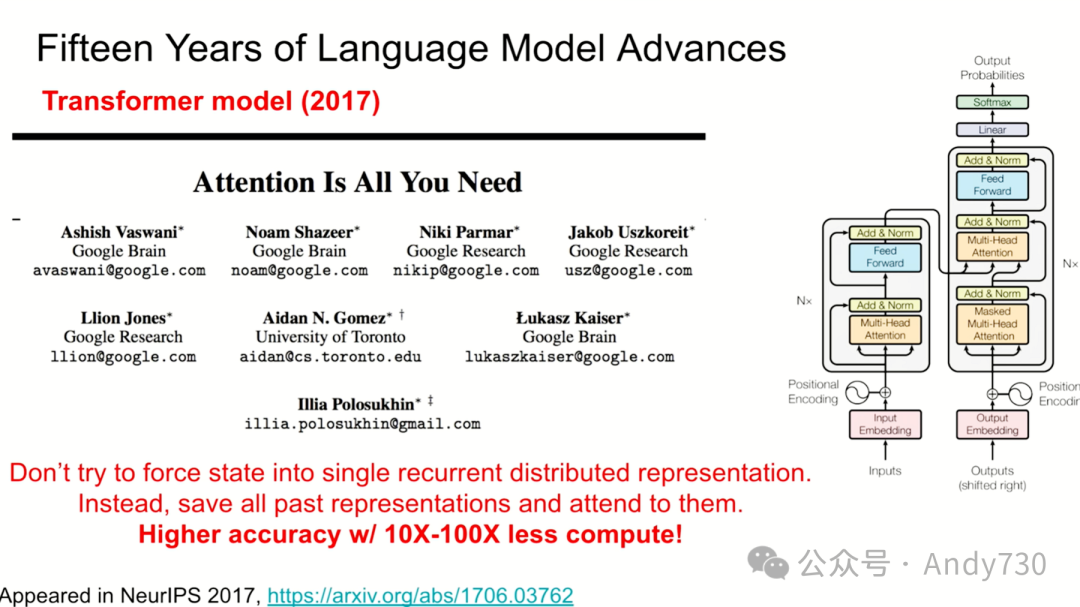 该模型的核心思想是不将状态强行压缩为单一的分布式表示。相反,可以保留所有已看到token或单词的表示,然后对其进行注意——比如在翻译句子的某一部分时,集中关注对该部分有用的信息。这种方法在减少计算量的同时,能够提高准确率。正如我之前提到的计算硬件的改进和专业硬件带来的显著提升,这些算法上的进步与硬件改进相结合,使得训练更大规模和更强大的模型成为可能。