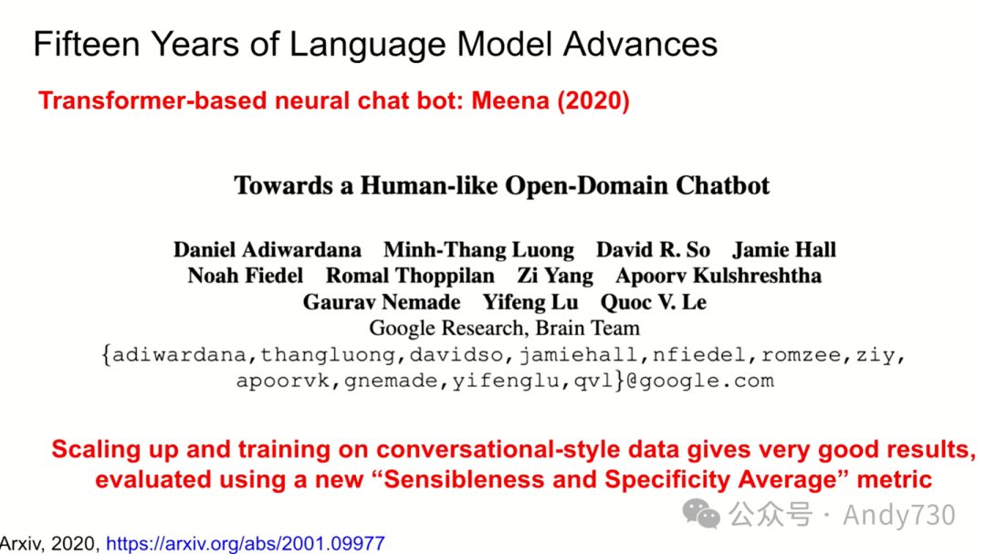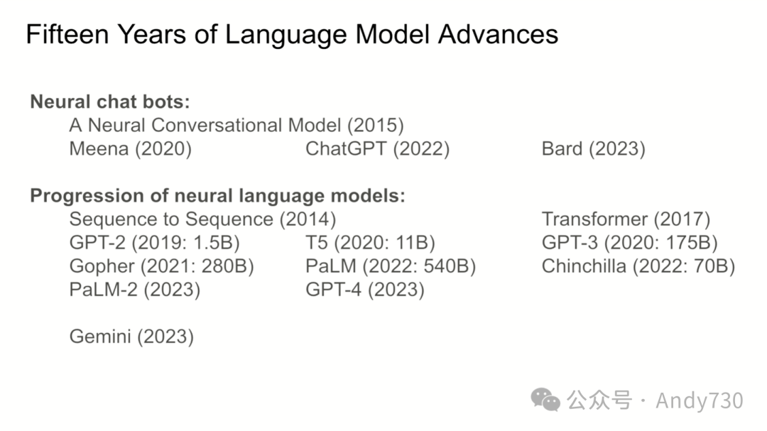 比如神经对话模型:Meena、OpenAI的ChatGPT、Google去年发布的Bard(现在已更名为Gemini),以及一系列神经语言模型的演进。