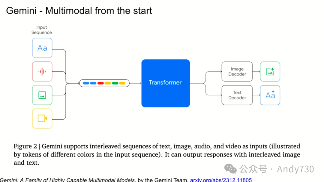 Gemini支持这些文本序列的交错输入。不仅可以单独输入IM文本和图像,还可以交错输入。例如,可以先输入视频帧和描述该帧的文本,然后再输入另一个视频帧和文本,或者是音频的字幕,然后让Transformer利用在训练中接触到的所有模态信息,构建跨模态的共同表示。