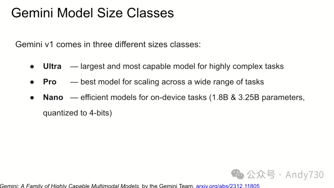 Gemini有几种不同的规模。Gemini的V1代有三种不同的规模:Ultra是最大和最强大的模型;Pro适合在数据中心运行,我们在很多产品上下文中使用这个模型。例如,Gemini正在使用Pro模型或Ultra模型。Nano模型则更适合在小型设备如手机或笔记本电脑上运行,它非常高效,适合这类设备。可以对这些模型进行量化,使它们更小。