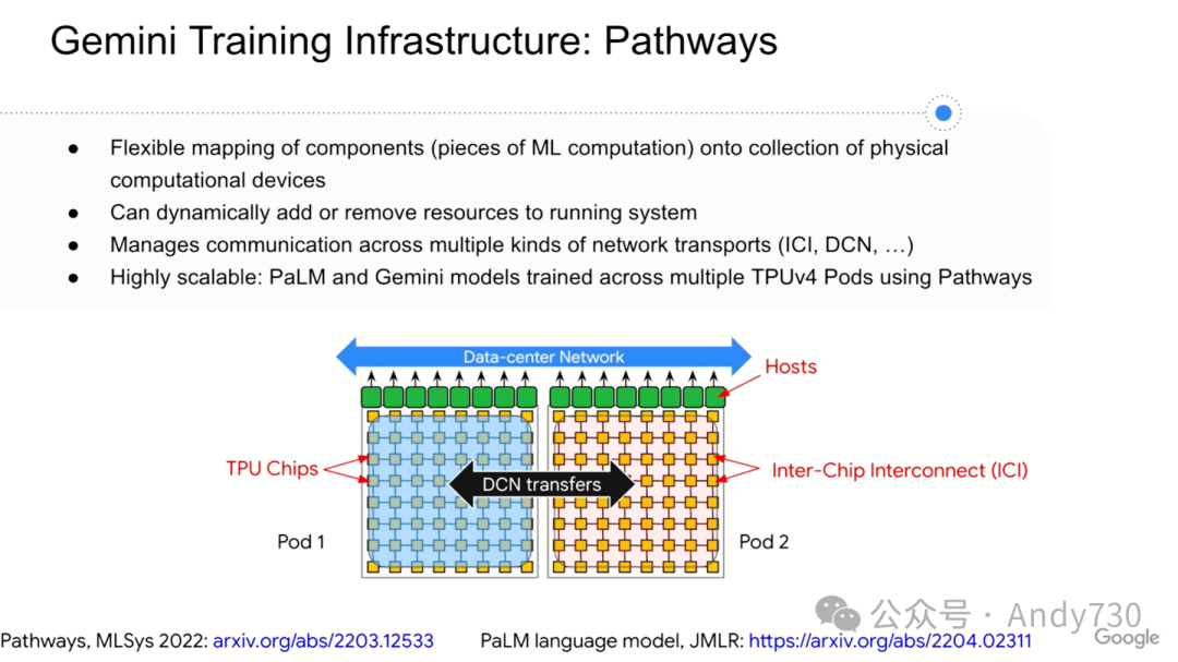 我们训练基础设施的一个特点是,我们希望拥有一个非常可扩展的系统,可以处理——你指定一个高级别的计算描述,然后系统会将这个计算映射到你拥有的硬件上。我提到过我们有这些计算集群。例如,你可以描述你的计算需求为“我关心这两个部分,但不关心它们的具体位置”,然后让我们构建的Pathways软件系统决定将它们放在哪里。系统可能会将一个部分放在一个集群上,另一个部分放在另一个集群上,并了解芯片的位置、拓扑结构和带宽。当一个芯片需要与另一个芯片通信时,它会使用之前提到的高速网络。当需要在模型的不同部分之间进行通信时,它会通过数据中心网络,这个网络的带宽较低来传输数据。但是这一切都非常无缝,机器学习研究人员或开发者无需从这个角度担忧,只需了解不同的性能特性即可。