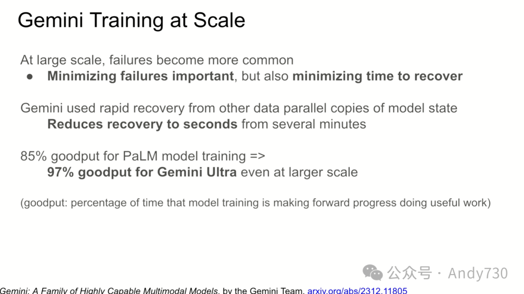 在训练大规模模型时,随着规模的扩大,故障的发生是不可避免的。机器可能会损坏,TPU芯片可能会过热并开始出现故障。因此,最小化故障非常重要。有些故障几乎可以被视为人为因素。例如,我们曾经使用一种全面升级机器内核的方法,这种方法在机器彼此独立计算时是完全可以的。然而,如果这些机器都参与到同一个千台机器的计算中,你其实更希望暂停所有机器,同时升级所有千台机器的内核,然后再重新启动,而不是在升级过程中不断发生故障。因此,我们对一些修复和升级过程进行了优化。此外,一旦发生故障,我们还需要尽可能缩短恢复时间,因为恢复得越快,模型就能更快地进行有效的前进。我们有一个指标叫做“有效吞吐量”(goodput),它衡量模型训练过程中实际产生有用进展的时间比率,而不是恢复检查点或等待系统其他部分启动的时间。