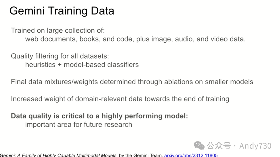 在训练数据方面,我们希望这个模型具备多模态能力,因此我们计划在大量的网络文档、各种书籍、不同编程语言的代码、图像、音频和视频数据上进行训练。我们对这些数据集进行了一些启发式过滤。部分启发式方法是手动制定的,一些则是基于模型的分类器,用来判断这些数据是否为高质量文档。最终的训练数据混合方案是通过对较小模型的消融实验确定的。我们会运行不同混合比例的小规模模型,比如使用32%的代码还是27%的代码,然后在广泛的指标上评估其性能,以更好地理解效果。我们还进行了一些调整,例如在训练结束时增加领域相关数据的权重,最终希望通过更多的多语言数据来提高模型的多语言能力。