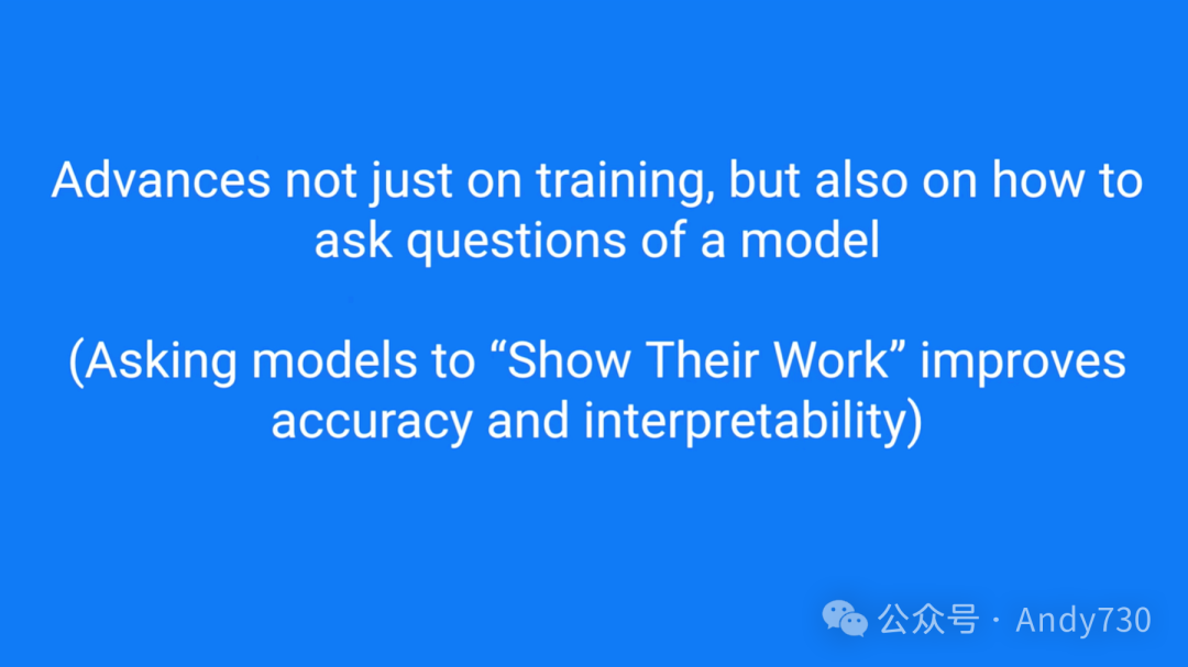 除了训练这些模型外,还有很多进展在于如何挖掘模型的最佳性能。如何以更有效的方式提问,使模型能够更好地回答问题?例如,要求模型展示其工作过程可以提高模型的准确性和可解释性。