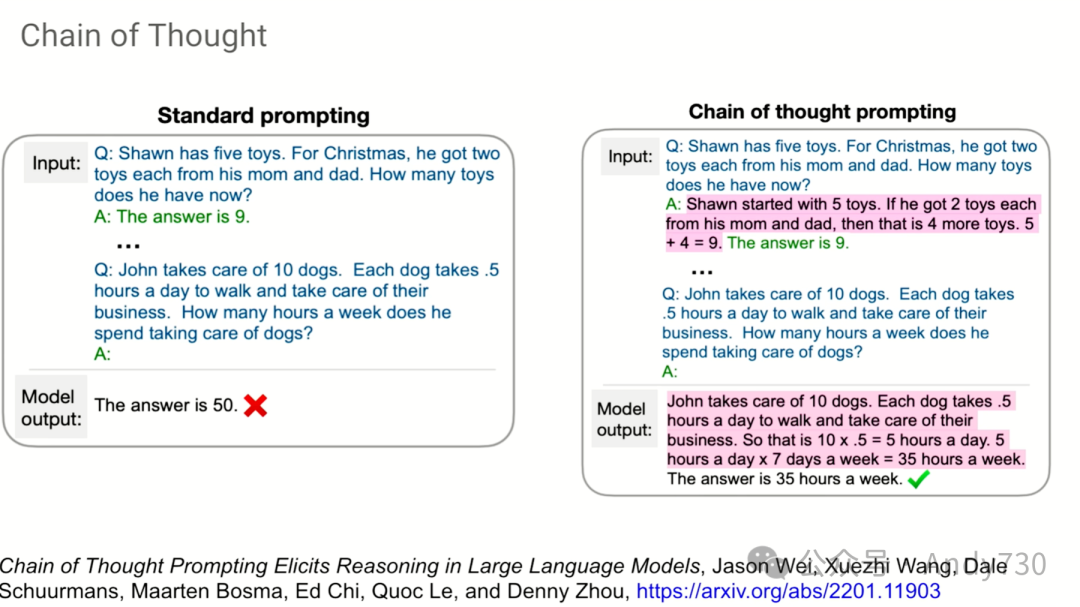 我的一些同事提出了一种叫做“思维链提示”(Chain of Thought prompting)的技术。如果你还记得三年级数学课,老师总是鼓励你展示你的解题过程。他们这样做的原因既是为了看到你得出答案的思考过程,也是为了鼓励你思考下一步应该怎么做,如何将复杂的问题分解成更小的步骤 。如果你给模型一个例子,展示一个问题和实际的答案,然后再给它一个新问题并要求它回答,你会发现模型表现得更好。