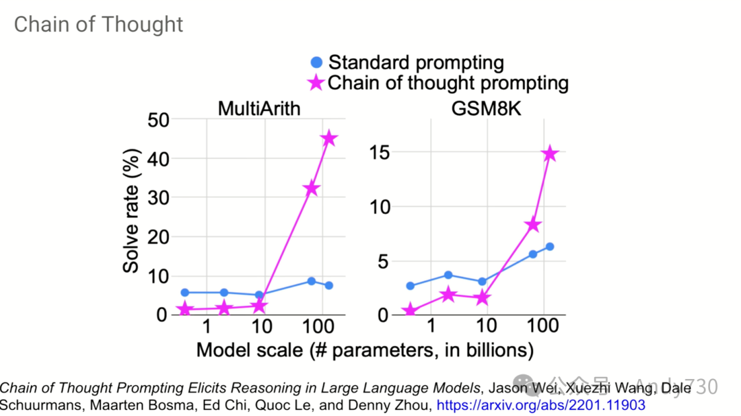 这实际上是一个非常显著的效果。这两条曲线代表了在不同规模下的相同基础模型。我们看到,这里有两个不同数学方向的基准测试:右侧是八年级数学问题,而左侧则是一些算术问题。你会发现,当仅使用标准提示时,模型的响应质量相当差,但一旦模型规模足够大,当你使用“思维链提示”时,模型的准确率会突然大幅提升。这表明,如何以一种更具解释性并且更可能给出正确答案的方式提问,是一种非常有趣的科学。
