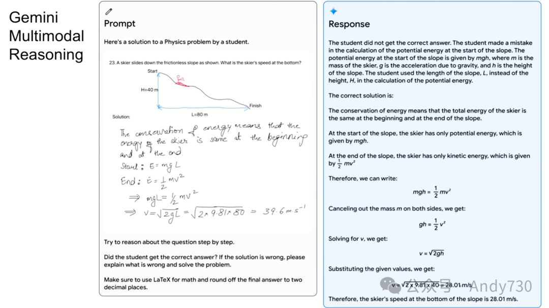 让我们来讨论一下Gemini模型的多模态推理。一个好的例子可以帮助我们理解这个模型的能力。假设有一个物理问题的学生解答,以及一张问题的图片和学生手写的答案。接下来,提示信息是让模型一步步推理问题。这就是“思维链提示”的风格。问题是学生是否得到了正确的答案?如果不正确,请解释哪里出错了并解决问题。确保使用LaTeX格式表示数学公式,并将最终答案四舍五入到小数点后两位。这就是输入,包括手写的图像、下坡的滑雪图和能量守恒等内容。模型的输出是:学生没有得到正确答案。学生在计算坡道起始位置的势能时出现了错误。起始位置的势能应由公式MGH给出。学生在计算中使用了坡道的长度(假设是斜边),而不是高度。正确的解决方案是,将数值代入公式,结果是9。我们将公式用LaTeX表示,便于阅读。通过这种方式,模型将问题解决到小数点后两位。