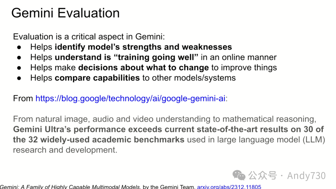 评估方面,这是一个关于Gemini能力的定性示例,但还需要看看它在各种特性上的表现。评价帮助我们识别模型的优缺点,并了解训练是否顺利进行。因此,我们在训练模型时会不断评估这些指标。这有助于我们决定是否需要更改某些内容,比如数学性能是否低于预期,是否应该在训练数据中加入更多数学相关的数据。但这会对多语言性能产生什么影响?有很多复杂的权衡,一些是在训练开始时做出的决定,有些则是在线监控中进行的原则性或即兴决策。同时,这也帮助我们将模型与其他系统进行比较。
