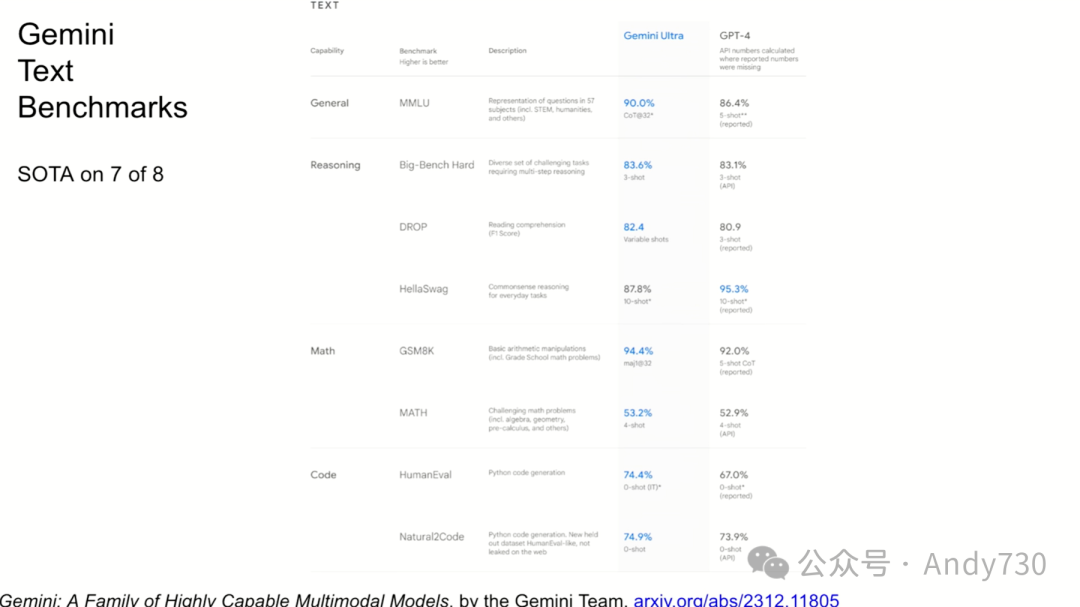 总体总结是,我们在32个学术基准测试中,Gemini Ultra模型在32个测试中的30个上超过了现有的最先进水平。如果我们深入分析这些测试,涉及到文本导向、一般推理或数学导向的基准测试。如果将Gemini Ultra与GPT-4(通常是这些问题的现有最先进水平)进行比较,可以看到,蓝色的部分代表了最先进水平。我们在八个基准测试中达到了七个的最先进水平。90%的MLU(多语言理解)是有趣的,因为这是57个不同学科的问题——化学、数学、国际法、哲学等。该基准测试组测得的专家水平表现为89.6%或89.8%。因此,我们在这57个类别中超越了人类专家水平,这非常令人满意。接下来还有一些编码相关和数学导向的基准测试。