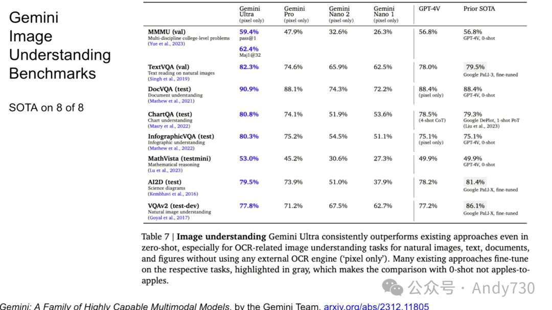 图像理解基准测试,这些测试现在涉及到模型的多模态能力。我们在所有八个基准测试中都达到了最先进水平。其中一个好处是,这个基准测试在我们发布论文前一周才公布,我们之前从未见过。因此,我们的验证团队迅速将其添加到验证集中,并发现我们超越了现有的最先进水平,并且差距相当大,这非常令人高兴。因为面对从未见过的基准测试并且表现出色总是令人振奋的,因为我们总是担心测试训练数据泄漏到测试集中。