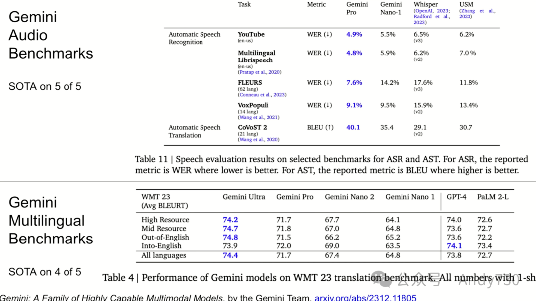 在视频理解方面,这个模型的多模态能力真正展现了光芒。在六个基准测试中,我们在六个上都达到了最先进水平,包括重要的英语烹饪视频字幕生成基准和视频问答等。至于音频,我们在四个不同的公共语音识别基准测试和一个语音翻译基准测试中的词错误率也都达到了最先进水平。我们的多语言能力表现也相当不错,我们在五个测试中的四个上达到了最先进水平。