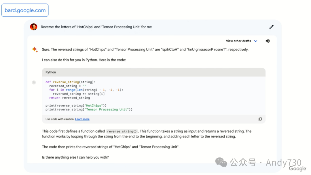几个月前我们还在使用Gemini模型时,我提到过将“HotChips”和“Tensor Processing Units”反向拼写。这样可以展示这些模型的能力。结果显示:“好的,反向字符串是……”很棒。但接着它还说:“我还可以为你用Python做这个。这里是代码。”定义了一个“反向字符串”函数,然后打印了该字符串的反向形式。模型还解释道:“这个代码首先定义了一个名为‘反向字符串’的函数,该函数将一个字符串作为输入。反向字符串函数通过遍历字符串来工作。代码然后打印反向结果,这总是有帮助的。还有其他我可以帮忙的吗?”这真是太令人惊讶了。有人提出了一个问题,模型不仅回答了问题,还提供了一个名为编程的东西和一些Python代码,并且展示了如何编写代码来实现这一点。这真的很酷。