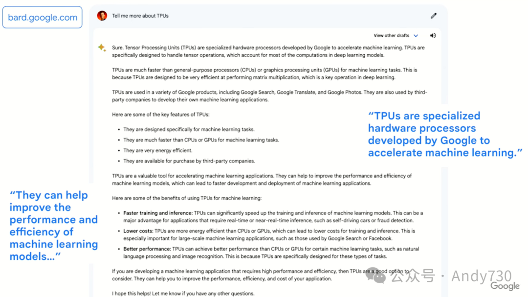 更重要的是,它提供了一个真实的教育机会。“还有什么我可以帮忙的吗?”“当然,请告诉我更多关于TPU的事。”模型具备了相当的世界知识。它知道TPU基本上是——我告诉过你很多这些内容——是Google开发的专用硬件处理器,用于加速机器学习。它们可以帮助提高效率和性能。这里是一些好处:更快的训练推理。希望这些信息对你有帮助。