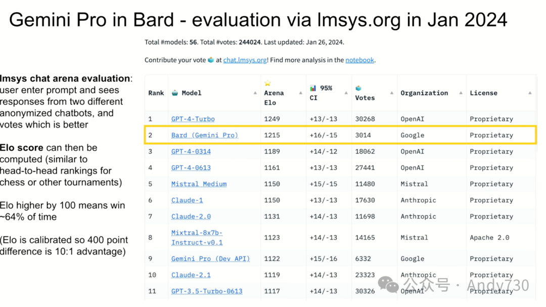 Gemini Pro模型实际上在这个排名中达到了第二高的ELO分数。大约有30个不同的模型,我展示的是排行榜的前几名,这非常令人印象深刻。这是一个免费的服务,而其他一些则不是。