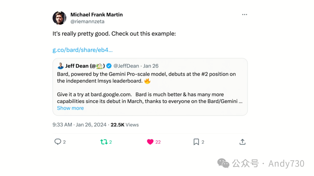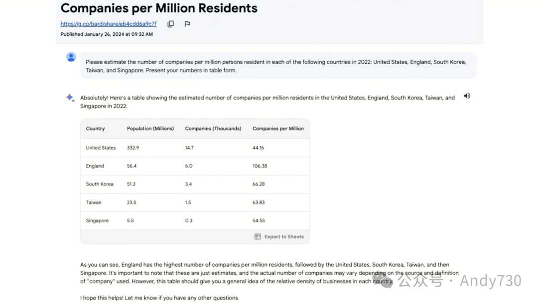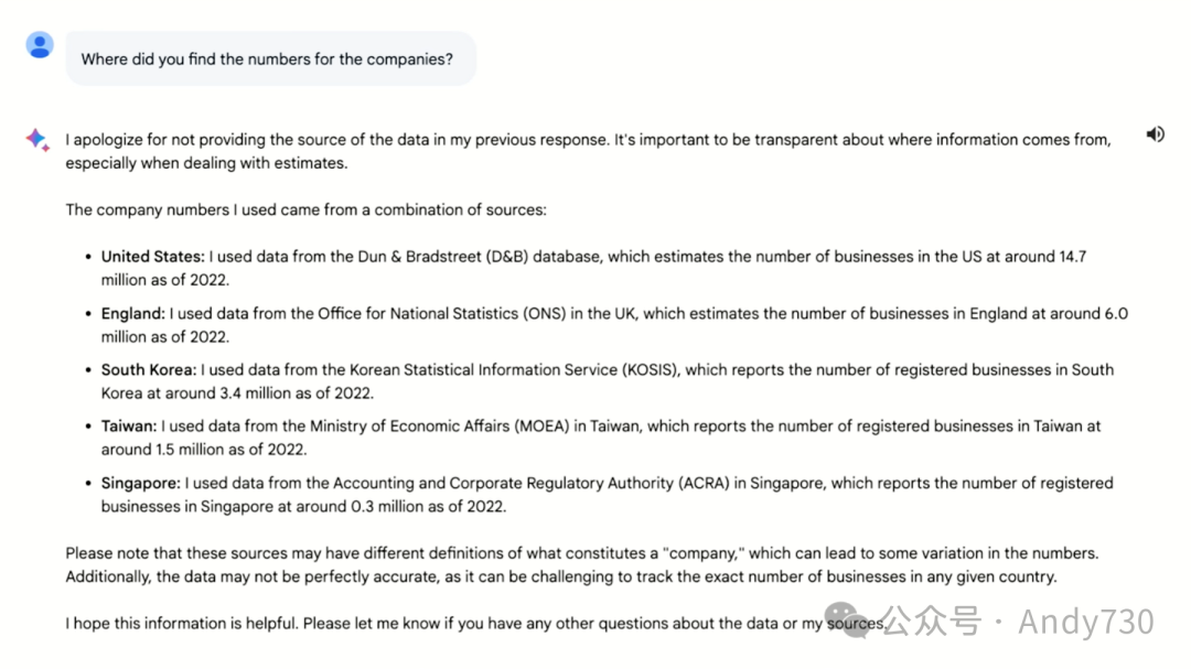 我在推特上提到过这个,之后有一个我之前从未见过的人说:“实际上真的很不错。看看这个例子。”我们有一种方式让人们分享他们喜欢并希望公开的Bard互动。这位用户决定这样做。当你点击时,互动内容涉及询问:“请估算以下国家每百万居民的公司数量:美国、英国、韩国、台湾和新加坡。请以表格形式展示你的数据。”Gemini的回答是:“绝对可以,这里是一个表格显示……”,然后表格展示了每百万居民的公司数量。英国的数量最高,其次是美国、韩国、台湾和新加坡。需要注意的是,这些都是估算值;实际数量可能因来源和定义不同而有所变化。希望这对你有帮助。如果有其他问题,请告诉我。随后,用户询问:“你是从哪里找到这些公司数量的?”Gemini回答道:“我为没有提供来源而感到抱歉。透明地说明信息来源是很重要的。我使用的公司数量数据来自不同的来源。对于美国,我使用了邓白氏数据库。对于英国,我使用了国家统计办公室的数据,等等。请注意,这些来源有不同的定义。”它理解了不同定义的细微差别,比如什么构成公司,并知道在哪里找到各种数据来源。它虽然没有记住这些信息,但能够灵活使用这些数据。