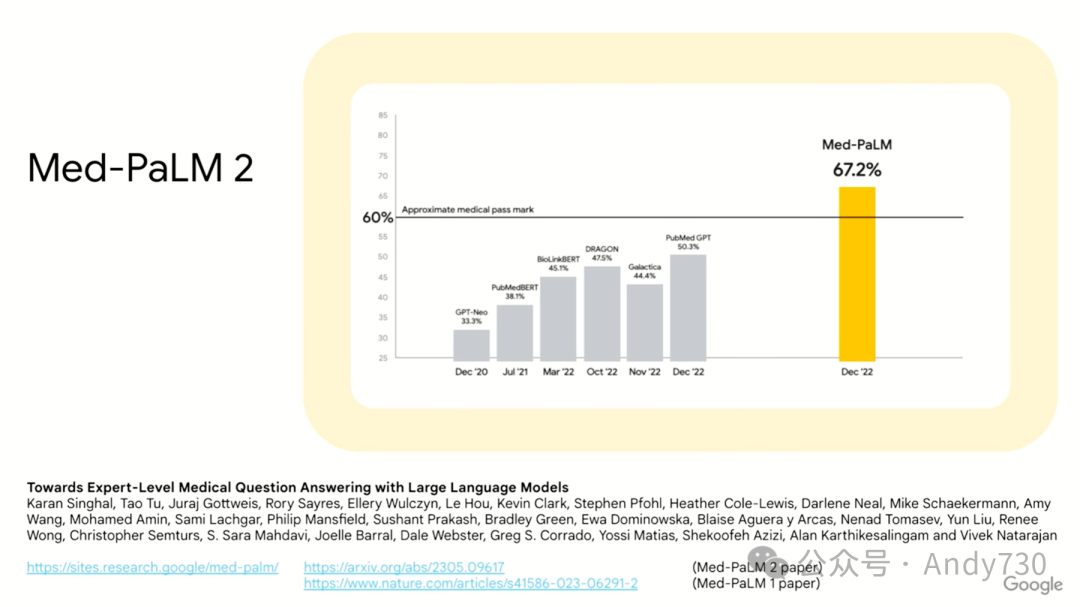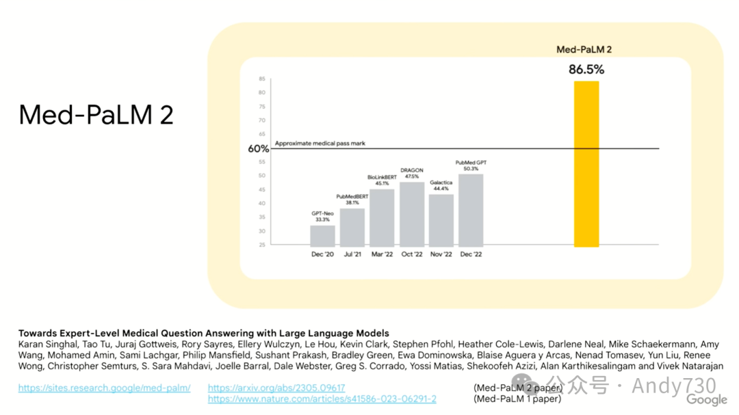 我的一些同事将我们早期的PaLM模型以及PaLM 2模型——这些都是在通用文本上训练的通用模型——进行了扩展和进一步训练,专门用于医疗数据,包括医疗问题和医疗文章。他们发现,第一个Med-PaLM模型实际上超越了医学委员会的考试通过标准。然后,六个月后,他们基于PaLM 2模型创建了Med-PaLM 2,并在这一特定任务上取得了专家级的表现。虽然这不是一个全通用的设置,而是一系列医疗问题,但它确实展示了将一个功能强大的通用模型通过领域专用的方式进行特定问题训练的能力。