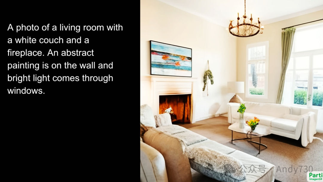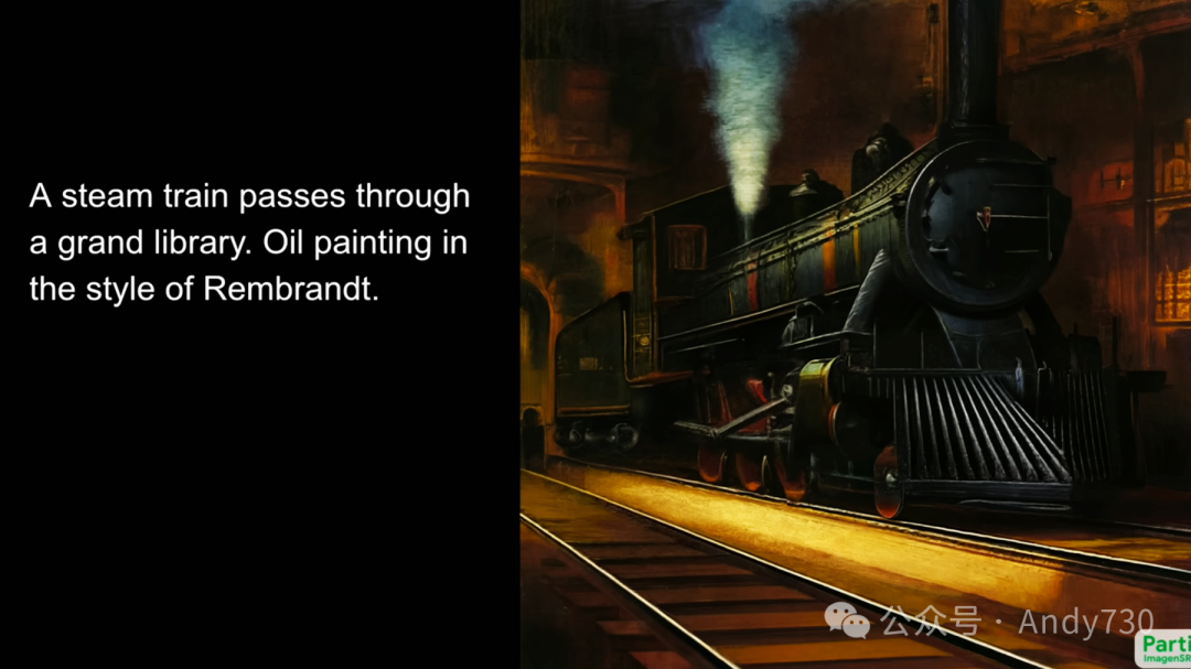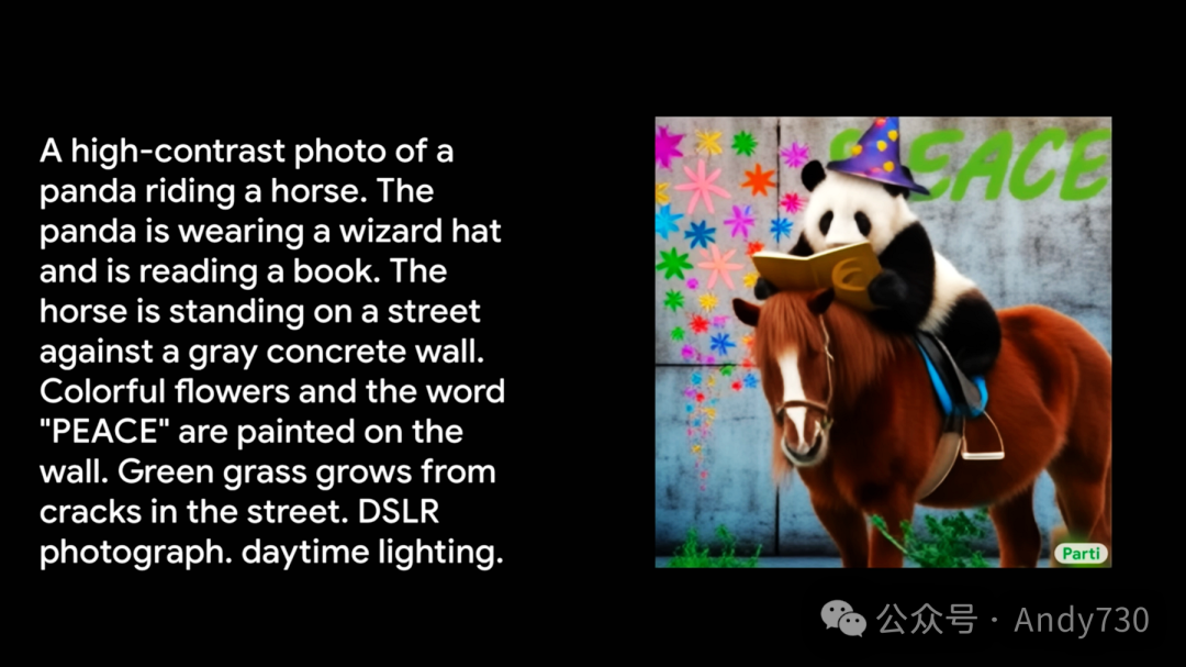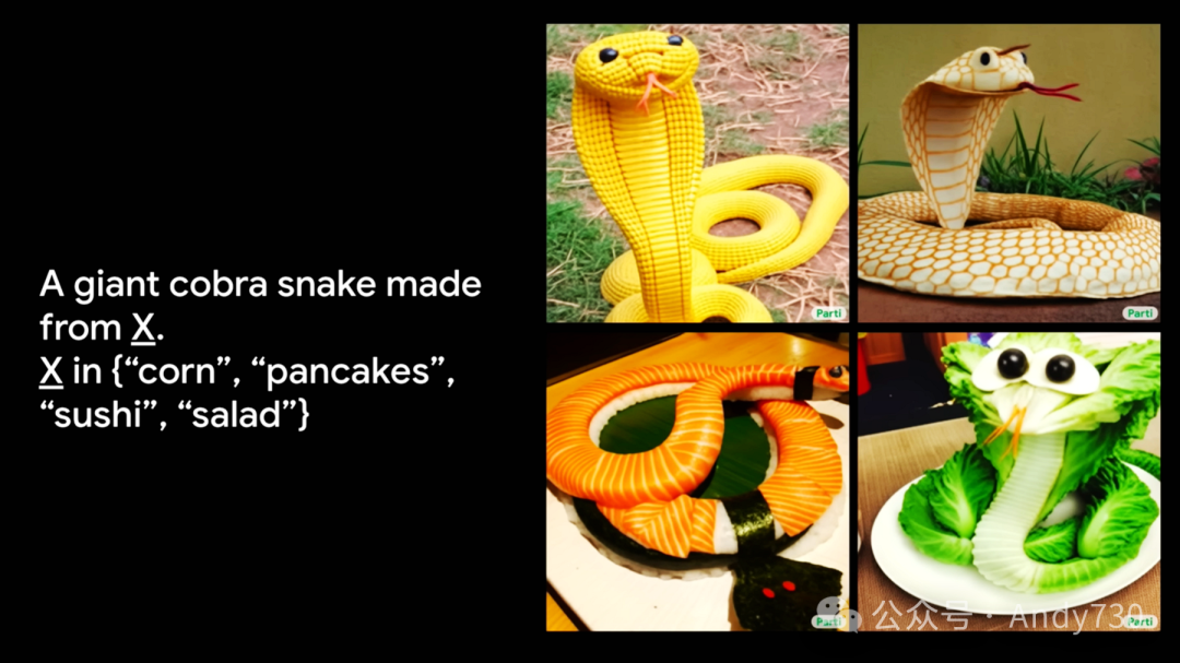 接下来,我将快速介绍生成模型在图像和视频生成方面的应用。你可能已经看到这是一个世界范围内的趋势。我们有几个不同的研究项目,如Parti和Imagen。一个有趣的方面是,你可以输入描述你想要的视觉图像的提示,然后模型生成这些图像,这些图像受到句子编码表示的约束,然后基于这个编码生成图像的像素。例如,“一列蒸汽火车穿过一座宏伟的图书馆,风格为伦勃朗的油画。”再如,“一条由玉米、煎饼、寿司或沙拉构成的巨大眼镜蛇——你最喜欢哪一种?”我个人喜欢那条看起来很凶猛的生菜蛇,但玉米蛇也相当不错。“一张白色沙发和壁炉的客厅照片,墙上挂着一幅抽象画,窗外阳光明媚。”如果你需要这样的图片用于演示文稿或其他用途,可以生成这样的图片,并且描述可以非常详细。例如,“一张高对比度的照片,一只熊猫骑在马背上;熊猫戴着巫师帽,读着一本书;马站在街道上,背景是灰色混凝土墙;有五颜六色的花朵和‘和平’这个字。单反相机拍摄,白天的光线。”这是一个很有可能的解释,但至少你可以得到一个符合要求的示例。