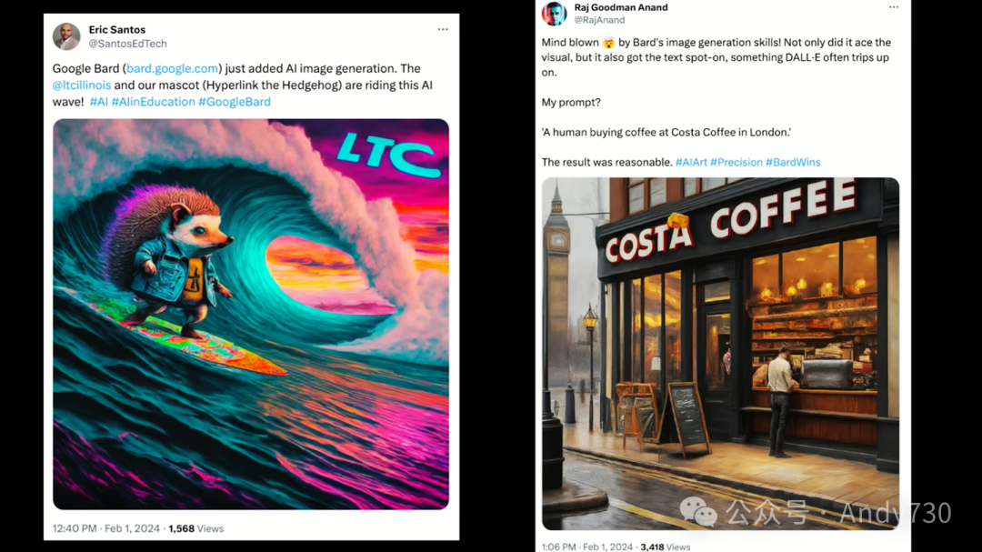 伊利诺伊州的K-12政府学校机构对能够创建其吉祥物Hyperlink the Hedgehog的图像感到非常兴奋。这里是Hyperlink在冲浪,骑在这波AI浪潮上。还有一个人对“一个人在伦敦的Costa Coffee买咖啡”的提示非常兴奋。Costa Coffee是一家非常受欢迎的咖啡连锁店。这些模型常常面临的一个问题是文本的保真度——即将你请求的文本正确地呈现为真实的字体等。这里你可以看到它做得相当不错。