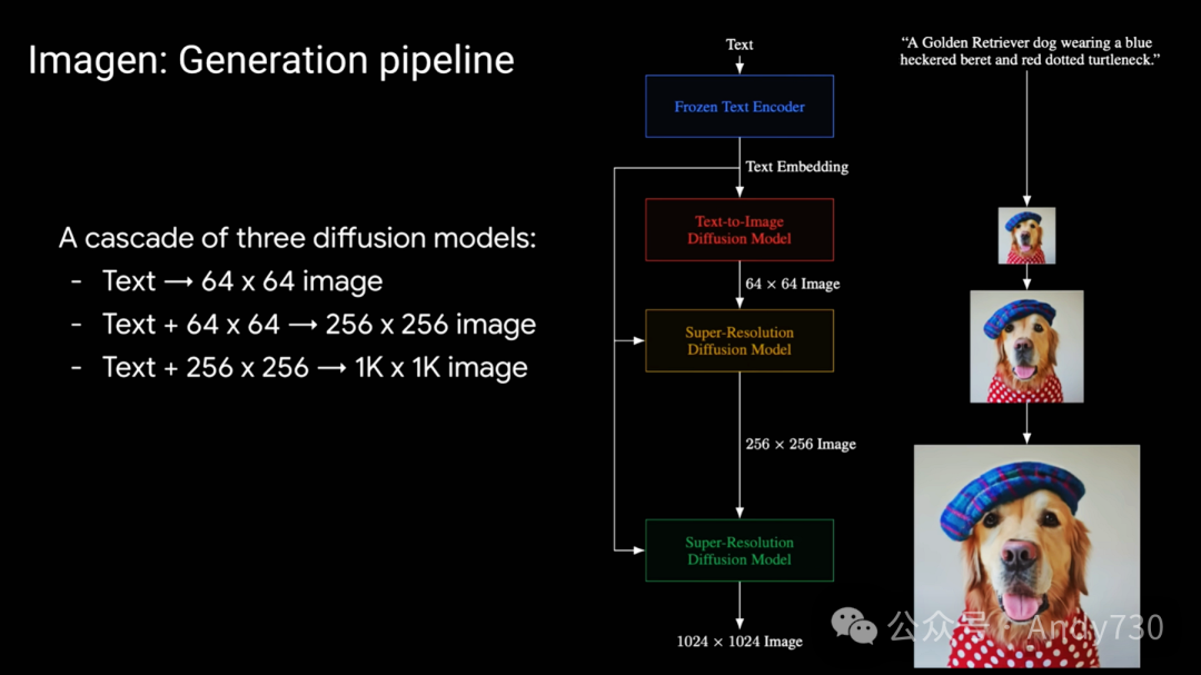 基本上,你输入一个提示,它会在分布式向量表示设置中给出这个句子的表示。然后,基于这个表示,模型首先生成一个小规模的图像,再用另一个旨在提高图像分辨率的模型,结合低分辨率图像和文本嵌入,进行处理。最后,我们将这个过程应用于较大的图像和文本嵌入,以生成全尺度的24x24图像。