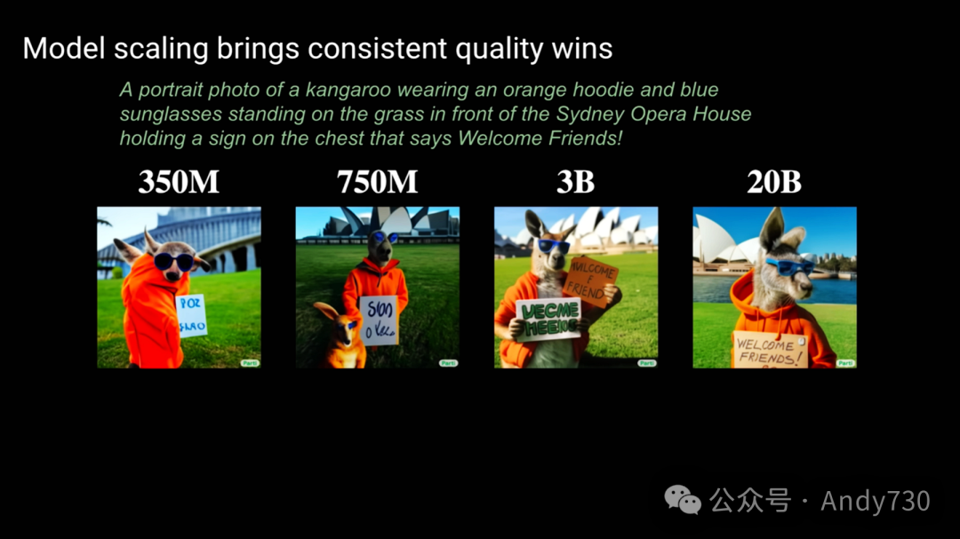 你可以真正看到规模的效果。如果我们训练四个不同的模型,参数从3.5亿到200亿不等,然后给它们相同的提示——“一张穿着橙色连帽衫和蓝色太阳镜的袋鼠的肖像照片,站在悉尼歌剧院前的草地上,胸前拿着写着‘欢迎朋友’的标牌”——你会看到,在最小的规模下,你能看到袋鼠的样子,但其他的细节很少。有标牌,但对文本的处理存在困难。随着规模的增加,袋鼠的形象稍微好了一些;它现在对悉尼歌剧院有了更多了解,但细节仍然较少,标牌接近‘欢迎朋友’,但可能是‘蔬菜我’,不确定。随着规模的进一步增大,你将获得一张相当不错的悉尼歌剧院、袋鼠以及带有正确文本的橙色连帽衫的图像。因此,规模是一个重要方面。这就是为什么你在过去十年中看到这些进展的原因:规模以及更好的训练方法和算法有助于提高结果的质量。这个图表实际上传达了相同的信息,但我觉得袋鼠说得更好。