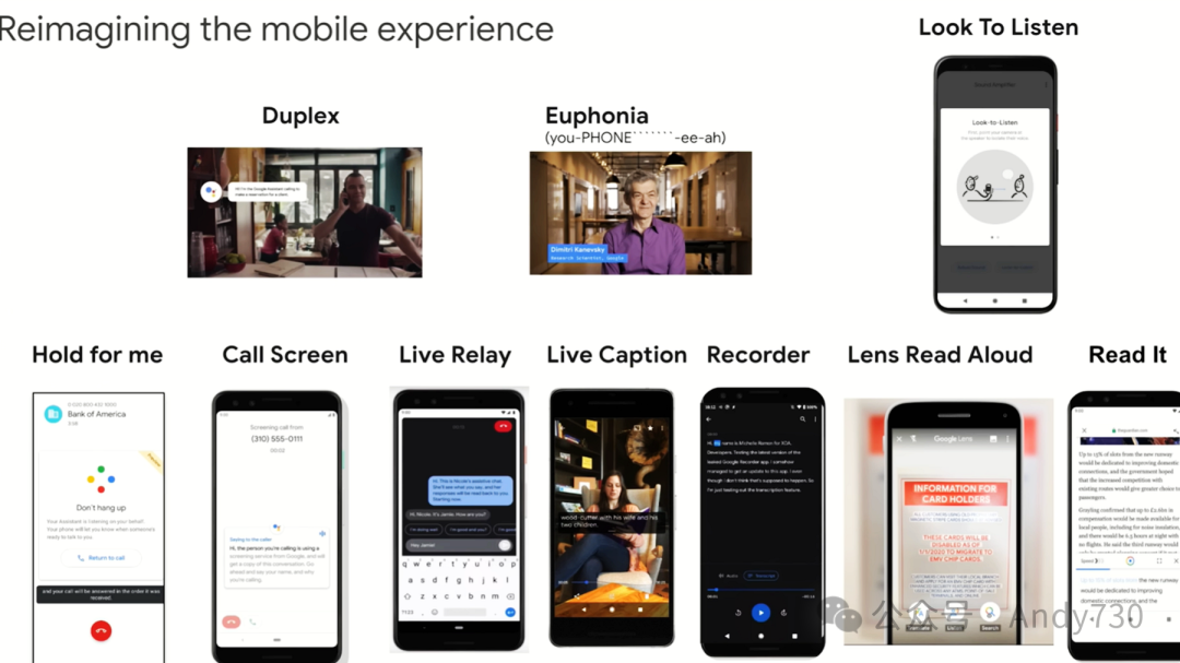 手机上有许多功能,其中很多功能涉及如何将一种模态转化为另一种模态。例如,有时你可能想要筛选电话,这时你可以让计算机生成的语音来接听电话,询问来电者的目的,然后将他们的话语转换成文本记录。这样,你就可以决定是否接听这个电话。功能如“为我保持”可以在你打电话给客户支持时代替你等待,避免你自己在电话上等待。实时字幕功能可以对你手机上播放的任何视频进行音频监听,并提供字幕。如果你在类似讲座厅这样的场合观看视频,又不希望音频打扰他人,这些功能就会很有帮助。许多这样的酷炫功能都在用户的手机上运行,而他们可能并不一定意识到或考虑到这些技术的存在。