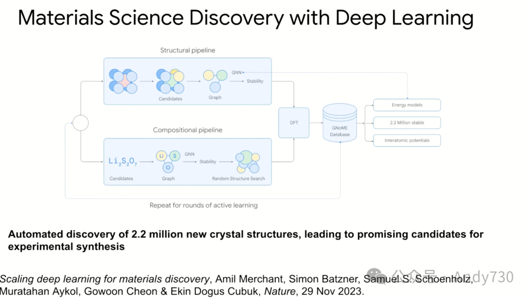 材料科学是一个相当有趣的领域,机器学习正在开始影响科学的许多方面,包括通过自动化探索科学假设空间的有趣部分,或者通过创建非常快速的模拟器,这些模拟器是通过学习得出的,而不是传统的大规模高性能计算(HPC)方式。在某些领域,你可以学习到一种功能上等同于手动编写的模拟器的模拟器,但速度快了10万倍。这意味着你可以在1000万种可能的化学品或材料中进行搜索,识别出有趣且有前景的材料,并具备某些特性,而这些通常需要更多的计算能力。我的一些DeepMind同事在寻找有趣的方式来搜索可能的材料空间,以发现那些具有有趣特性的材料。他们有一个结构化的流程,可以将潜在材料表示为图形神经网络,并且一个组合流程可以将已知的结构变异成有趣且相邻的结构,然后利用现有的材料数据库来输出能量模型和一些稳定且有趣的可能化合物。这种自动化发现2.2百万种新晶体结构的方法,为实验室实际合成提供了许多有趣的候选材料,以观察它们的性质。