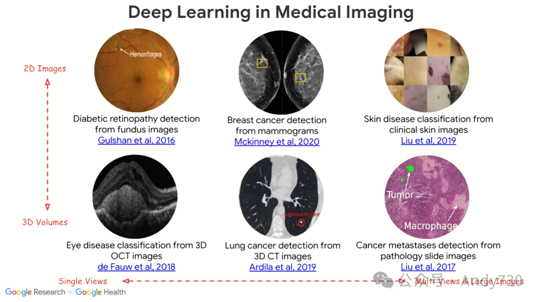 机器学习在医疗保健的各个方面都有巨大的潜力。我们在医学影像和诊断领域已经做了大量工作,这些问题范围从二维图像到三维体积图像(如MRI或其他类型的三维CT扫描),再到仅有单一视图的图像,以及有多个视图和大尺寸高分辨率图像的病理学图像等。我将简要介绍其中两个领域。