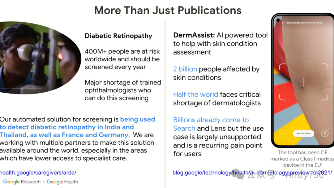 我们与印度的组织、印度眼科医院网络、泰国政府、以及法国和德国的合作伙伴建立了合作关系,每年进行大量的筛查工作。接下来是皮肤科。皮肤科的特点是你不需要特殊设备就能获取用于诊断皮肤疾病的数据。我们现在部署了一种系统,你可以拍摄某物的照片,如视频中所示,系统将提供该物可能的性质,以及在皮肤病数据库中类似的其他图像。这可以帮助你判断这个问题是否非常严重,或者是否相对无害。