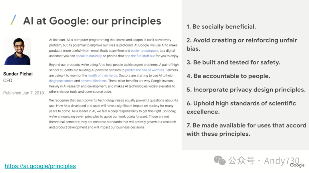 最后,深入和广泛理解机器学习方法在全球范围内的应用是非常重要的。从进行基础的机器学习研究,到在我们所有产品中广泛应用,我们开始思考一套原则,用于考虑使用机器学习的影响。在应用机器学习的各种方式中,我们应考虑哪些因素?2018年,我们发布了一套原则,旨在帮助教育我们内部团队有关机器学习的知识,以及在应用这些技术解决问题时需要考虑的事项。