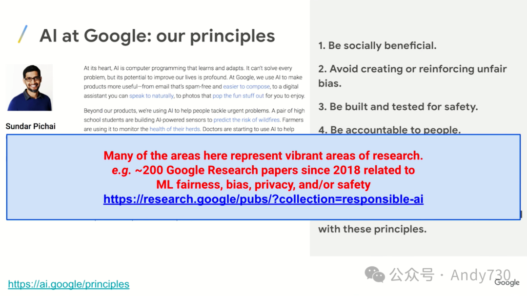 例如,对人负责:我们认为让模型具有可解释性是重要的方面。在适用的环境中,敏感地处理隐私问题,并确保其具有社会效益。这些都是积极的研究领域。过去五六年间,我们发布了大约200篇关于公平性、偏见、隐私或安全性的论文。