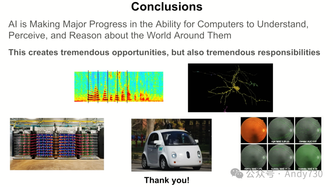总的来说,现在是计算领域激动人心的时刻。我们正经历从手动编写的软件系统到通过学习进行交互的系统的变革,这些系统可以以各种有趣的方式与世界互动,并以有趣的方式与人交流。计算机现在能够处理、理解和生成的模态正在不断增长,这将使计算机的使用变得更加自然和无缝。我们常常限制自己只通过键盘输入,但现在我们能够以非常自然的方式与计算系统对话。系统将理解我们说的话,并能够以自然的声音作出回应,或者根据我们的要求生成漂亮的图像。这是非常令人兴奋的。尽管机会巨大,但责任也很重。
