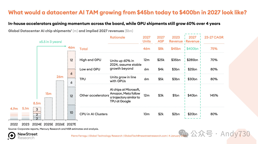 首先,2027年在AI芯片上的具体情况预计如下:GPU和TPU的出货量预计将增长四倍,其他内部开发的加速器的规模预计将增长至目前TPU规模的两倍。