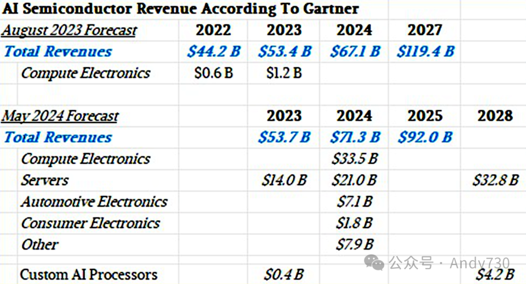 现在让我们来看看最新的市场情况。Gartner和IDC近期发布了一些关于AI半导体销售的统计数据和预测,这些数据值得我们仔细研究,以便更好地了解当前和未来几年AI芯片市场的格局。