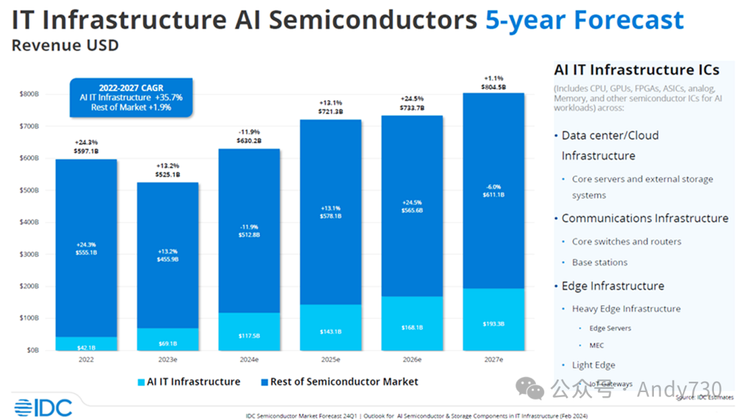 现在来看IDC对AI半导体和AI服务器市场的看法。几周前,该公司发布了一张值得关注的图: