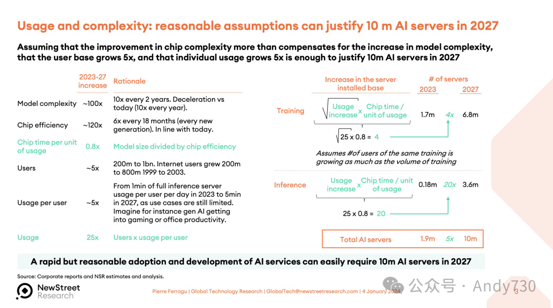 这个预测合理吗?从使用情况来看,这确实有可能实现。这将支持生成式AI用户数量从2亿增长到10亿人,同时每用户每天的平均服务器使用时间预计将从1分钟增加到5分钟。