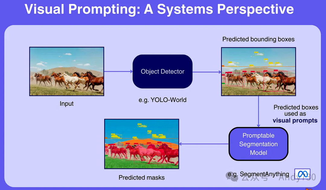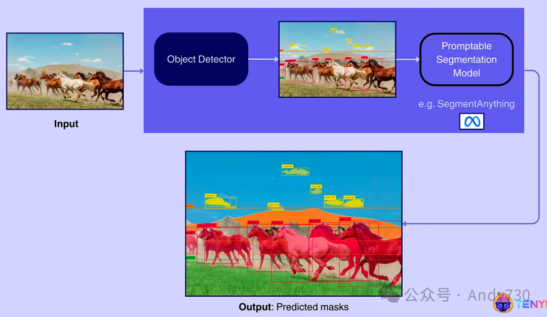 输入图像:系统处理的起点是一张输入图像,本例中展示的是一群在广袤田野上驰骋的马匹。 对象检测:该步骤通过对象检测器(如YOLO-World)对输入图像进行处理,识别并定位图像中的各个物体,随后生成围绕这些物体的边界框。输出结果清晰地展示了每匹马周围的边界框,以及天空中云朵的小框。 分割:接下来,这些检测到的边界框作为视觉提示被传递给可提示的分割模型(如SegmentAnything)。该模型基于这些提示,为每个检测到的对象生成精确的掩膜,从而实现对图像的细致分割。