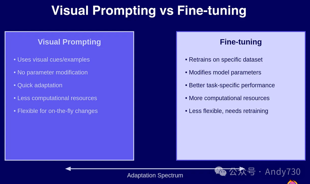 图1直观展示了在计算机视觉基础模型框架下,视觉提示与微调之间的主要差异。视觉提示巧妙地利用视觉线索或示例来引导模型行为,这一过程无需对模型参数进行任何修改,从而赋予了高度的灵活性和较低的计算成本。相反,微调则要求我们在特定的数据集上重新训练模型,通过调整其参数来优化针对特定任务的表现,但这往往伴随着更高的计算资源消耗。