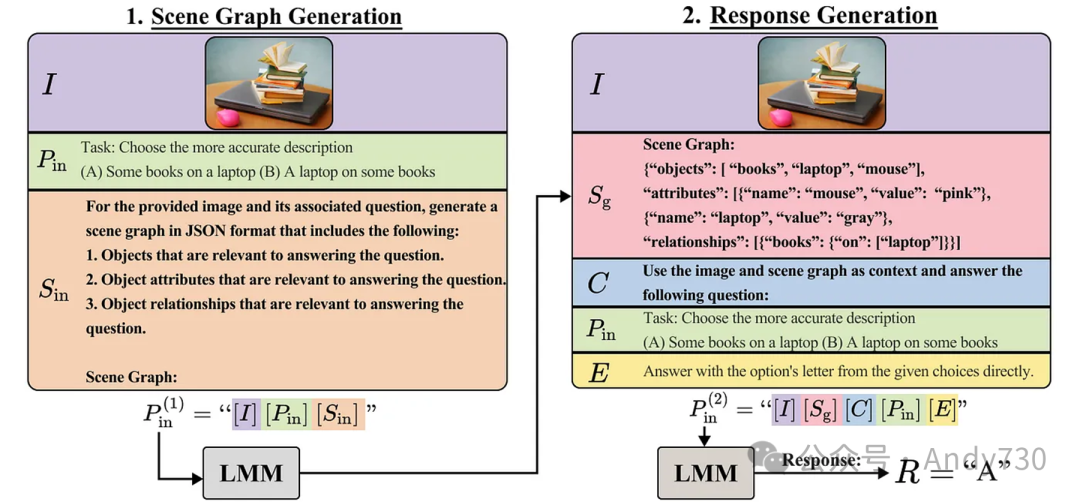 图5:CCoT完整提示示例说明:首先,结合图像和任务提示生成场景图。随后,利用图像、场景图及问题提示引导大型多模态模型(LMM)提取答案。