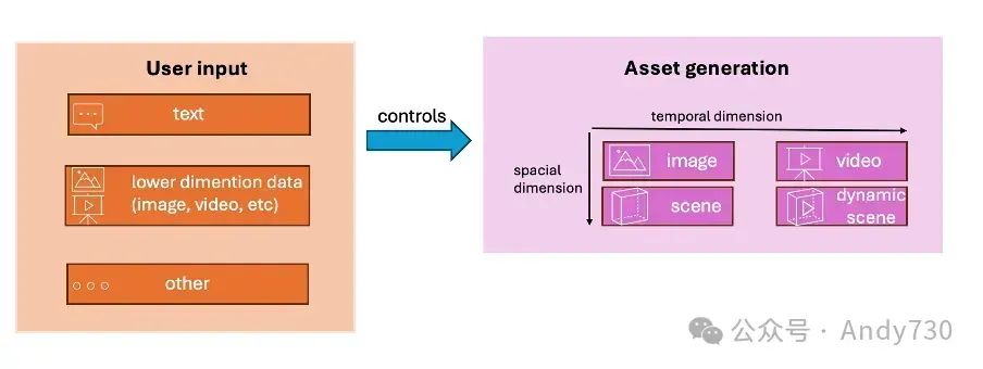 过去十年间,生成建模技术受到了广泛研究。特别是近年来,随着扩散模型的兴起,图像生成技术取得了显著突破,如今,研究人员正致力于攻克更具挑战性的3D和4D内容生成任务。下图直观展示了多样化的生成任务及用户如何灵活指定所需生成的内容。