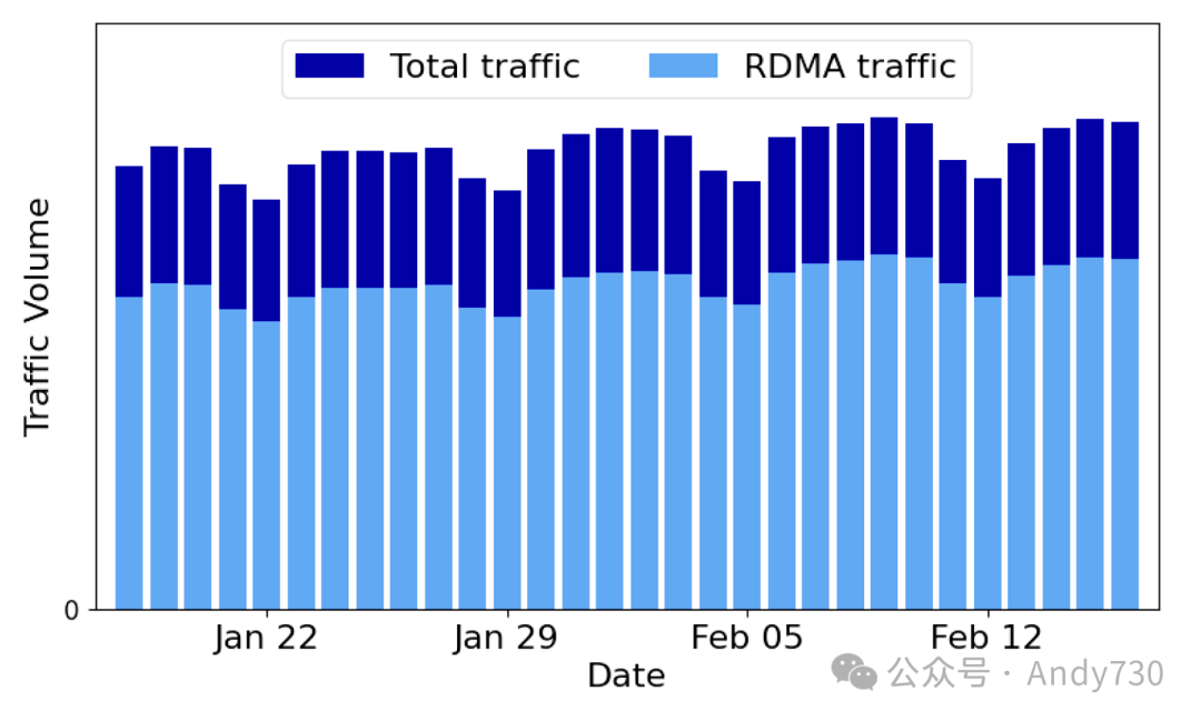 图1:2023年1月18日至2月16日期间,Azure所有公共区域的流量统计数据。该数据通过收集所有顶部机架交换机(ToR)服务器端口上的交换机计数器来测量。结果显示,大约70%的流量采用了RDMA技术。