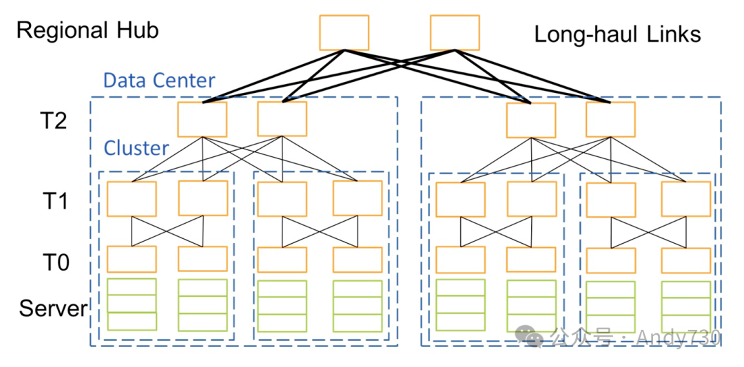 机架(Rack):包含一台T0交换机及其直接连接的服务器集合。 集群(Cluster):由连接至同一组T1交换机的多个机架组成。 数据中心(Datacenter):则是由连接至同一组T2交换机的多个集群构成。 区域(Region):通过一组RH交换机相互连接的数据中心集合。值得注意的是,与数据中心内部短距离(几米至几百米)的链路相比,T2与RH交换机之间通过长达数十公里的长距离链路相连。