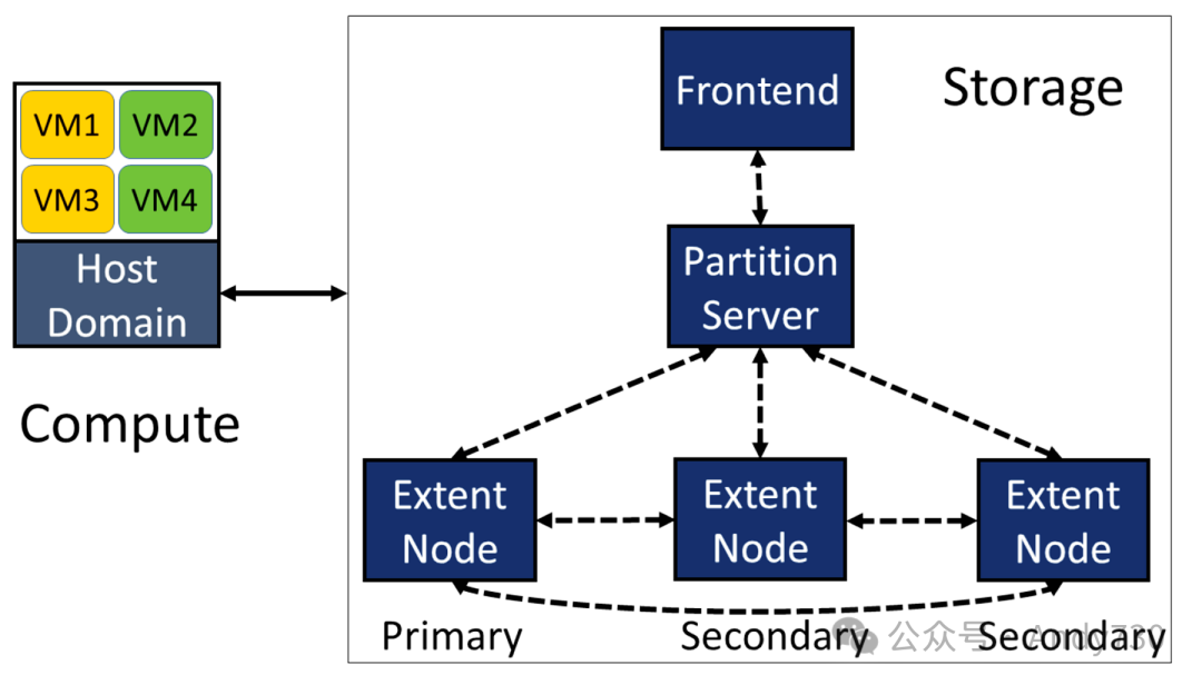 当VM需要写入硬盘数据时,运行在计算服务器主机域中的硬盘驱动程序会向相应的存储集群发送I/O请求。FE或PS将解析并验证这些请求,然后生成对流层中相应EN的请求以执行数据写入操作。在流层中,文件实际上是由一系列称为“区段”的大型存储块有序排列而成。写入文件时,数据会被附加到当前活动区段的末尾,并且该区段会在存储集群中被复制三次以确保数据的持久性。只有在收到所有EN的成功响应后,FE或PS才会将最终响应发送回硬盘驱动程序。相比之下,硬盘读取操作则有所不同。FE或PS会从任意EN副本中读取数据,并将读取结果发送回硬盘驱动程序。
