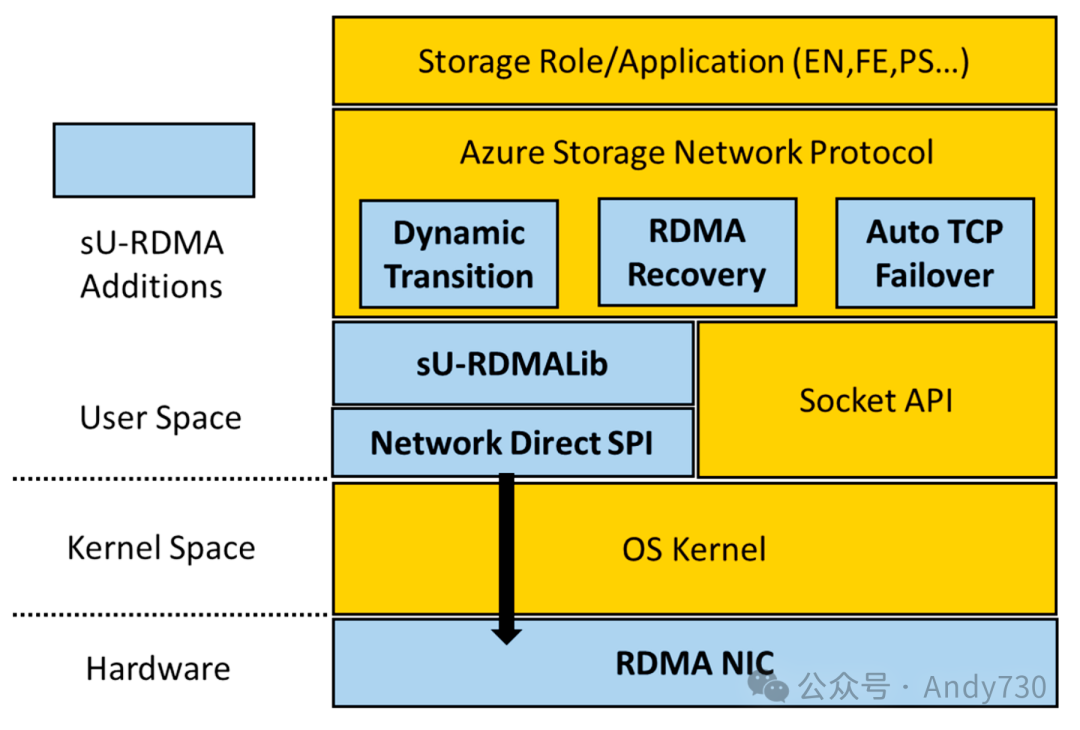 sU-RDMA[87]专为存储后端(存储到存储)通信设计。图4展示了包含sU-RDMA模块的存储后端网络栈架构。Azure存储网络协议作为一种直接服务于应用程序的RPC协议,用于传输请求和响应对象。它通过套接字API实现连接管理、消息发送与接收。